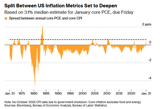 令鸽派人士担忧的是,在2021年通胀开始起飞时,PCE指标其实是先于CPI开始攀升的。如果1月份的核心PCE真如经济学家预测的那样,那么它超过核心CPI的同比幅度,将创下几十年来之最。