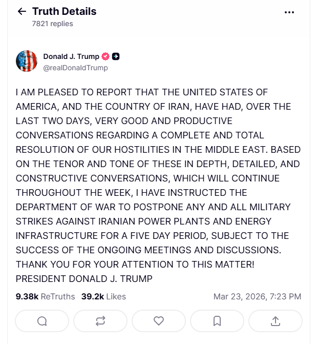 当天早些时候,就在所谓的“最后48小时最后通牒”结束前,美国总统特朗普突然在其社交媒体平台“真实社交”上发文称,“美国和伊朗在过去两天进行了非常良好和富有成效的对话”,对话将持续至本周末。他还指示暂停对伊朗发电厂和能源基础设施的一切军事打击,为期五天,但前提是正在进行的会议和讨论取得成功。
