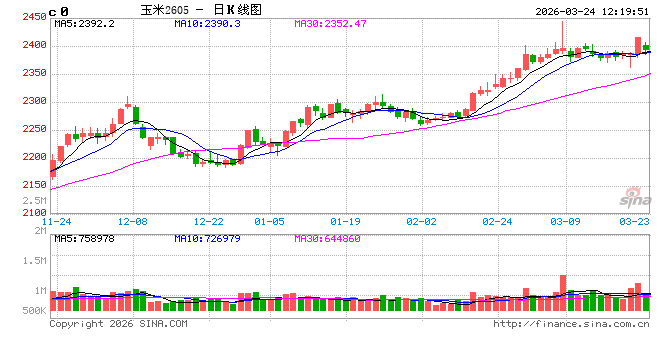 1.盘面表现:上周玉米05合约延续偏强震荡,但上行动能有所减弱。主力05合约收于2385元/吨。周内期货市场冲高回落,3月9日主力2605合约曾一度冲高至2443元/吨,刷新阶段性峰值,随后进入震荡调整。