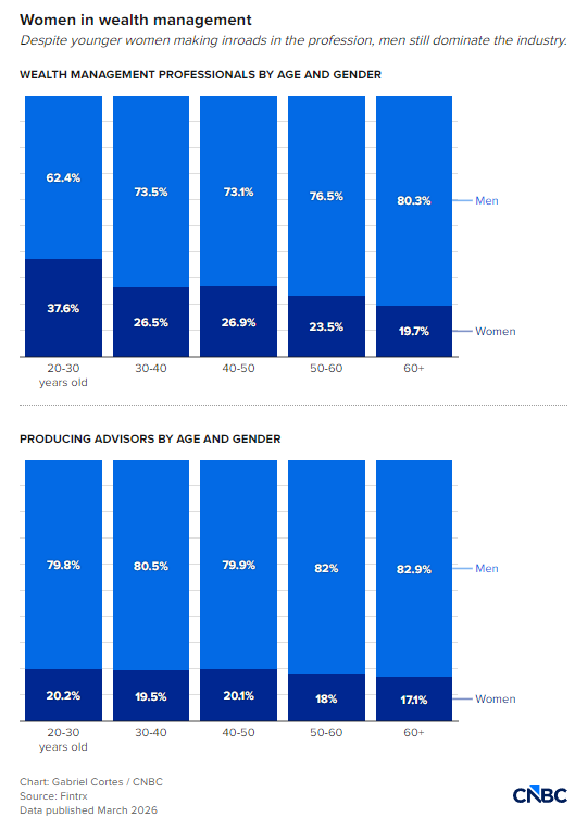 Fintrx 数据显示,这一性别差距同样体现在高管层。女性在财富管理公司高管岗位中占比 21.5%,且更可能担任首席运营官、首席财务官,而非首席执行官或投资相关职位。