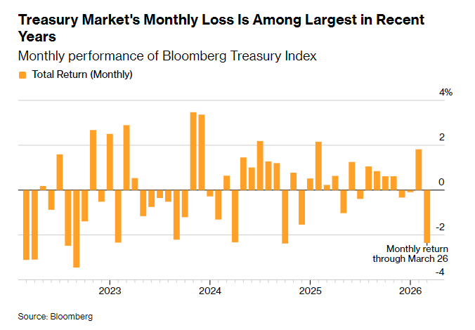 周五的市场走势使美国国债市场料将录得近五年来最糟糕的月份之一。根据相关美债指数,截至3月26日,美国国债市场本月累计下跌2.36%。若维持这一跌幅,本月将成为自2024年10月以来表现最差的月份。