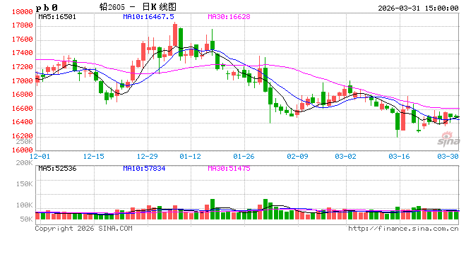 今日沪期铅走势:今日沪期铅小涨,沪铅主力合约2605开盘报16510元,高点报16530元,低点16475元,结算价16500元,收盘16500元/吨,涨30元,涨幅为0.18%。伦铅最新价报1916美元,涨4美元。