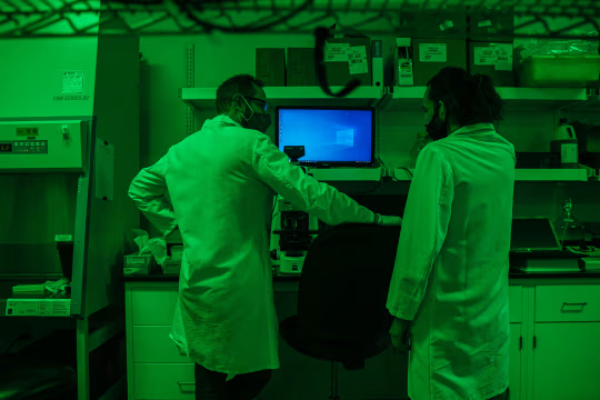 2021 年,研究人员在圣地亚哥 Viridos 实验室采集藻类样本。埃克森出资委托该公司改造藻类基因结构,试图提炼出足量石油,让藻类生物燃料项目具备技术可行性。