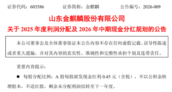 金麒麟(603586)公告,公司拟向全体股东每股派发现金红利0.45元(含税)。截至2026年4月3日,公司总股本1.96亿股,以此计算合计拟派发现金红利8822.38万元(含税)。
