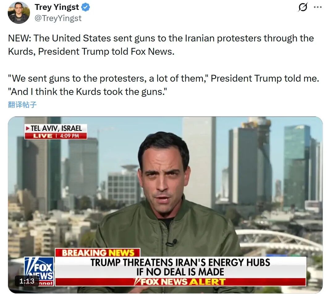不过,共和党“御用”媒体福克斯新闻的首席外事记者特里·英斯特(Trey Yingst)近日爆料称,特朗普在电话采访中首次承认,美国在此次抗议期间曾试图秘密武装伊朗抗议者,然而运送的大量枪支并未送达目标人群,他怀疑是被作为中间人的库尔德反政府武装扣下了。