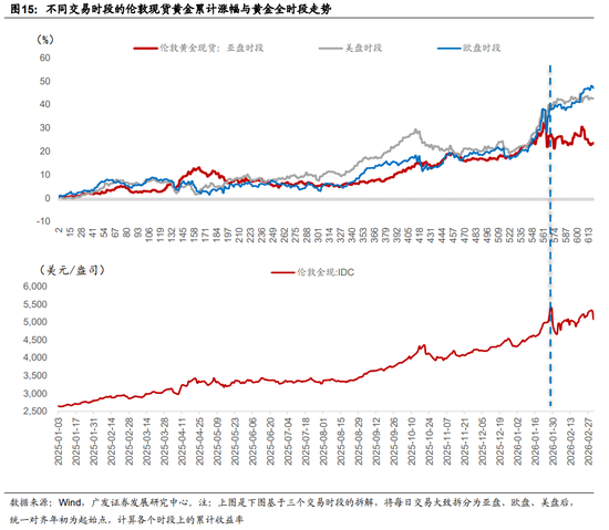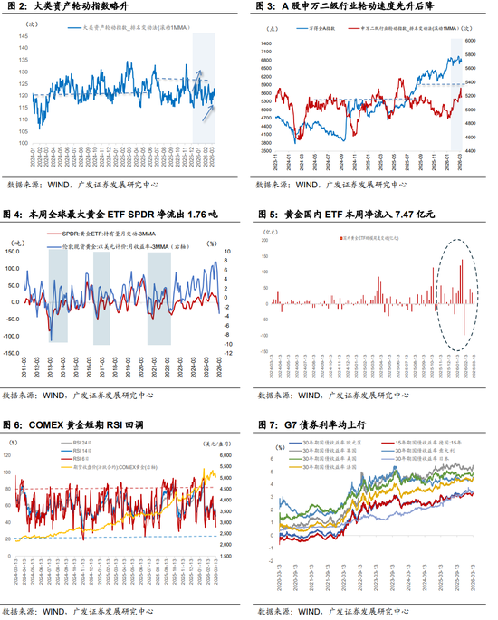 二是全球商品显著分化,亦处于地缘冲突的“分化反应阶段”,原油继续冲高,黄金高波收跌,“黄金—美元”跷跷板,有色白银震荡。原油市场受地缘风险溢价驱动强化,潜在供应中断与中国经济复苏下的需求修复加剧供需缺口,布伦特原油期货活跃合约周涨11.27% 收于103.14美元/桶。贵金属方面,金银走势分化。伦敦金现全周先扬后抑,与美元呈“跷跷板”节奏,最终收于5044.6美元/盎司附近,周跌1.62%;伦敦银现周涨1.65%至83.7美元/盎司,金银比小幅回落至60.3。技术视角下,黄金隐波维持高位,波动于30%-34%区间,仍高于自1968年以来的历史波动中位数(15.9%)。COMEX黄金短期RSI随价格回落而回调,临近超卖区间。资金需求方面,本周国内黄金ETF净流入7.47亿元(上周为净流入34.51亿元),黄金SPDR持有量净流出1.76吨,全球及国内资金均出现明显撤离迹象,追高意愿明显下降。此外,央行购金步伐也有所放缓。跨市场方面,伴随人民币汇率波动,沪金溢价倒算黄金购买力走阔至6.9740,沪金全周跌0.72%。2026年开年至今,金银累计涨幅已收窄至17.1%,16.3%。