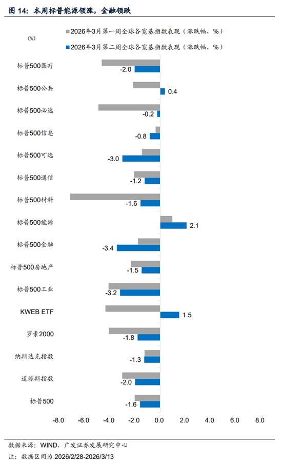 一是全球股市继续承压,仍处于地缘冲突的“分化反应阶段”,全球科技股普调,欧美日“滞胀交易”升温,美联储降息预期后延至年底,能源与防御板块收涨。我们编制的大类资产轮动指数维持中高位,周均变动频次略升至122次(上周为120次)。MSCI发达市场下跌1.46%、新兴市场下跌1.40%。美股三大指数齐跌,纳指、标普500、道指录得-1.26%、-1.60%、-1.99%。地缘风险持续加剧“滞胀”担忧,推动股市谨慎情绪,周内伊朗最高领袖发表强硬电视讲话,霍尔木兹海峡存在关闭风险,标普500恐贪指数降至-275.01。而结合美股隐波与地缘风险指数的对比来看,当前虽然美股市场情绪趋于避险,但尚未至恐慌状态,市场仍有TACO博弈。截至3月13日,VIX指数维持在27.19%,远高于历史中位数(16.6%),但尚且不属极端,远低于2025年4月初的52.33%,仅处于历史25%分位数。与之对比,全球地缘风险指数GPR偏离中位数更远,3月9日维持在394.17,处历史69%分位,而历史中位数仅为105.37。而VVIX指数维持131.05,提示市场当前的这一预期并不稳定,波动率的波动指数尚未收敛。标普行业中,除能源(+2.1%)、公共(+0.4%)外均下跌,其中金融(-3.4%)、工业(-3.2%)领跌。罗素2000指数(小盘股)下跌1.8%,纳斯达克指数下跌1.3%。股市整体收缩现象显著。科技资产延续分化态势,TAMAMA指数周跌1.36%,费城半导体指数周涨1.76%。七姐妹周内涨少跌多,英伟达以1.37%的幅度领涨,META领跌,跌幅为4.83%。亚马逊 (Amazon) 因预计2026年资本支出高达2000亿美元,引发市场对其投资回报的担忧,股价周内一度大跌,其周跌幅为2.6%。