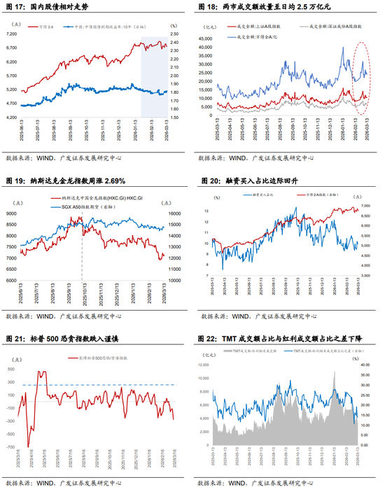 第三,海外方面,一是伊朗战局推升油价,布伦特原油期货结算价3月13日收盘103.1美元/桶,国际能源署宣布释放创纪录的4亿桶战略储备[3],但并未对油价形成抑制。二是美国通胀粘性较高,经济数据有所弱化,核心PCE同比升至3.1%,高于市场预期的2.9%[4];四季度GDP环比折年率从1.4%下修至0.7%[5]。三是联邦地区法院首席法官3月13日公开裁定撤销联邦检察官向美联储主席鲍威尔发出的传票[6],裁决书认为政府未能提供任何证据证明鲍威尔存在违法行为,所谓罪名实质上仅是因为其政策立场引起总统不满。