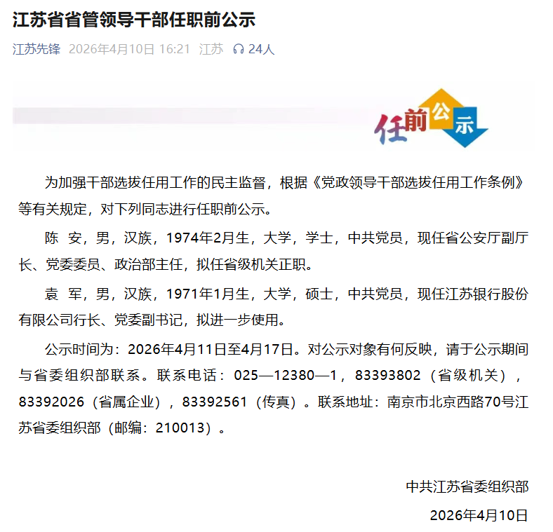 江苏银行行长袁军拟进一步使用 admin 今天 5 默认 摘要: 4月10日金融一线消息,据“江苏先锋”官微,江苏省委组织部发布省管领导干部任职前公示显示,现任江苏银行行长、党委副书记袁军,拟进一步使用。 公开资料显示,江苏银行现任董事长... 4月10日金融一线消息,据“江苏先锋”官微,江苏省委组织部发布省管领导干部任职前公示显示,现任江苏银行行长、党委副书记袁军,拟进一步使用。 公开资料显示,江苏银行现任董事长为葛仁余,现已年满60周岁。 打赏 觉得文章有用就打赏一下文章作者 支付宝扫一扫打赏 微信扫一扫打赏 海报 阅读 QQ 分享 微博分享 微信分享 分享 上一篇锁定四大应用场景!汇丰、渣打拿下香港首批稳定币牌照,后续门槛将持续高企 下一篇朝鲜最高领导人金正恩会见王毅 锁定四大应用场景!汇丰、渣打拿下香港首批稳定币牌照,后续门槛将持续高企上一篇 朝鲜最高领导人金正恩会见王毅下一篇 相关推荐 农村中小银行行政许可新规征求意见!农村商业联合银行被纳入 2026-04-10 江苏银行行长袁军拟进一步使用 2026-04-10 长江有色:10日碳酸锂现货价下跌,紧平衡博弈加剧 2026-04-10 违反基金销售规定 同花顺基金被浙江证监局责令改正 2026-04-10 上海率先创建个人本外币兑换特许行业自律机制 2026-04-10 西部水泥午前涨逾5% 近日与南非Africa Sam公司订立售股及认购协议 2026-04-10 双良节能(600481)误导性陈述被处罚,股民索赔可期 2026-04-10 国开行发行60亿元绿色金融债券 2026-04-10