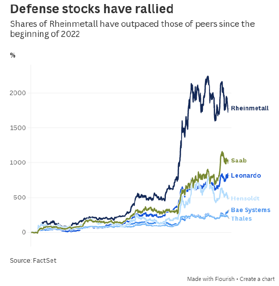 不过在发布业绩指引后,莱茵金属股价下跌 8%。杰富瑞分析师称该预期 “务实但偏温和”,并表示投资者对该股期望过高 —— 自 2022 年初以来,其股价已累计上涨1700%。