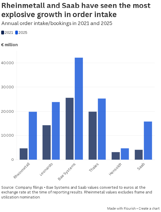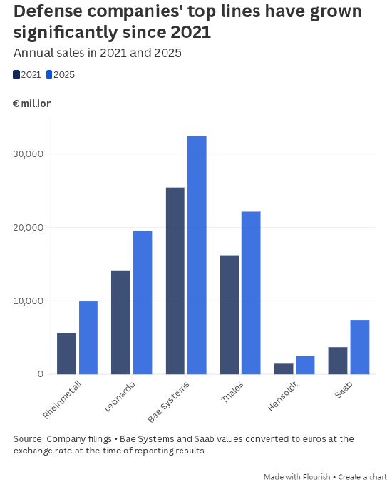 莱昂纳多宣布计划到 2030 年实现利润翻倍;就在前一天,德国军工同行莱茵金属也预测今年销售额最高可增长 45%。两家企业目前均手握创纪录的订单积压量。