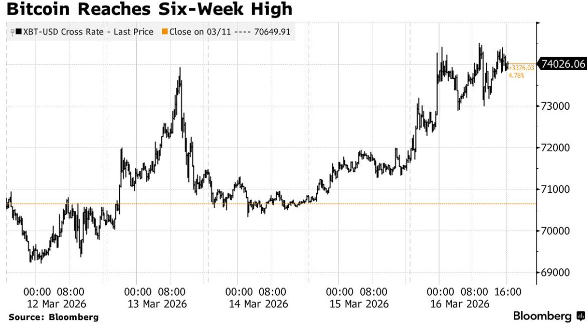 这一最大的加密货币一度上涨约 4% 至 74512 美元,创下 2 月 4 日以来的最高水平,随后回吐了部分涨幅。比特币目前较去年 10 月创下的历史高点仍下跌了约 40%。