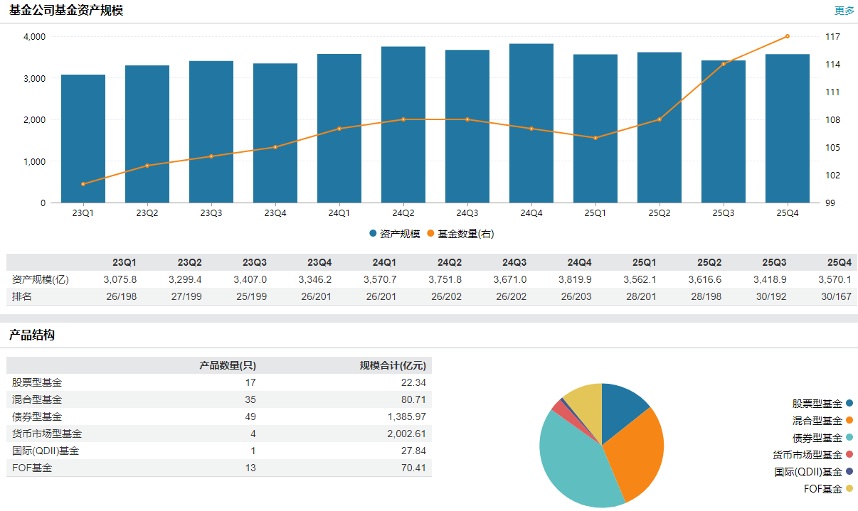 从产品结构看,固收业务仍是公司的核心底盘,债券型基金规模超1385亿元,货币基金超2000亿元,两者合计占比近95%。与此同时,权益类产品规模相对较小,股票型与混合型基金合计约105亿元。
