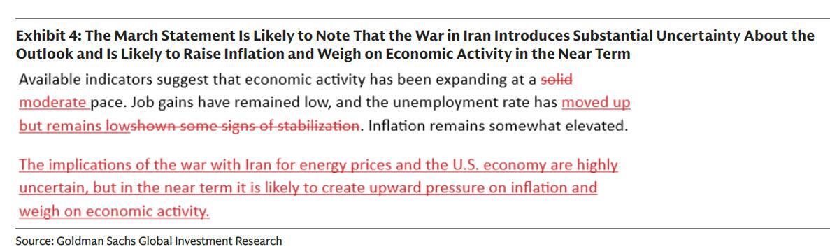 高盛认为,FOMC声明可能会承认伊朗战争增加了前景的不确定性,并可能在短期内推高通胀并拖累经济活动。声明还可能将活动增长描述为“温和”而非“稳健”。鉴于最新的就业消息,委员会可能会适度下调其对劳动力市场的描述。