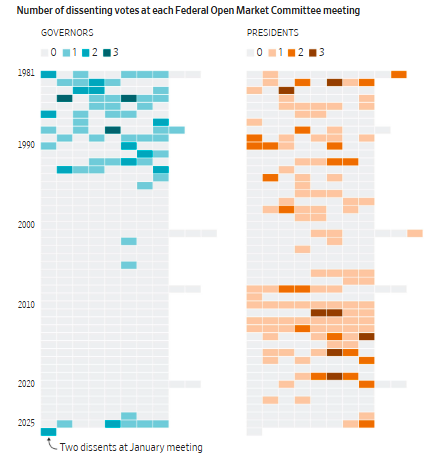Timiraos指出,本周,这三位理事都有可能投下反对票,主张降息。此事的关键不在于票数差距,而在于这三位理事都是由一位公开要求降息的总统所任命。自1988年以来,还从未出现过三名理事在同一次政策会议上集体投下反对票的情况。