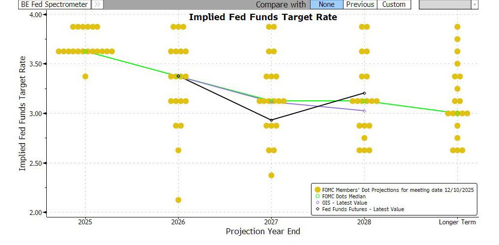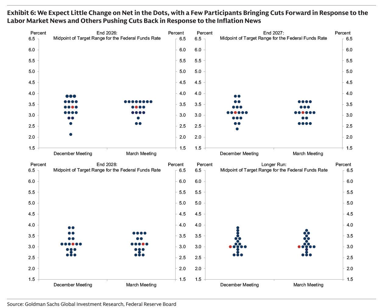 高盛预计,今晚最新点阵图显示的2026年利率中位数可能会落在3.25%至3.50%之间,而2027年、2028年及更长期利率的可能会落在3.00%至3.25%之间。