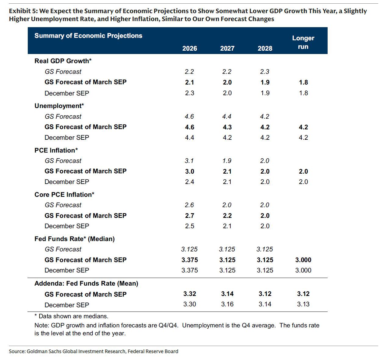 而目前来看,最新经济展望摘要确实有可能显示美联储对2026年的预测出现不利调整。高盛预期的变化包括了: