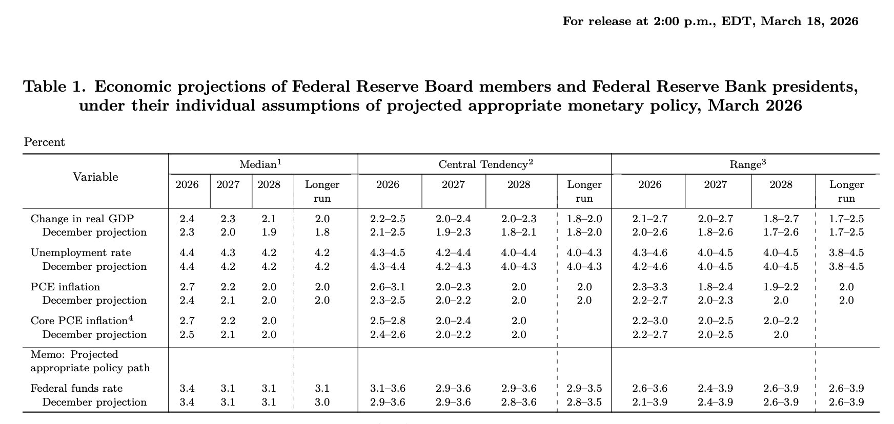 美联储最新一期季度经济预测摘要显示,美联储已将2026年个人消费支出物价指数(PCE)涨幅预期中值从2.4%上调至2.7%,核心PCE预期中值从2.5%上调至2.7%;2027年通胀预期也略有上调。