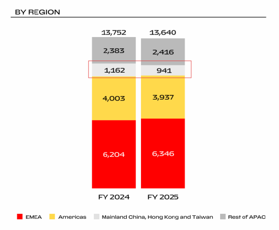 其中,法拉利在中国市场的销量下滑更为严峻。财报显示,2025年法拉利在中国市场的销量从2024年的1162辆减少至941辆,同比下滑超19%。