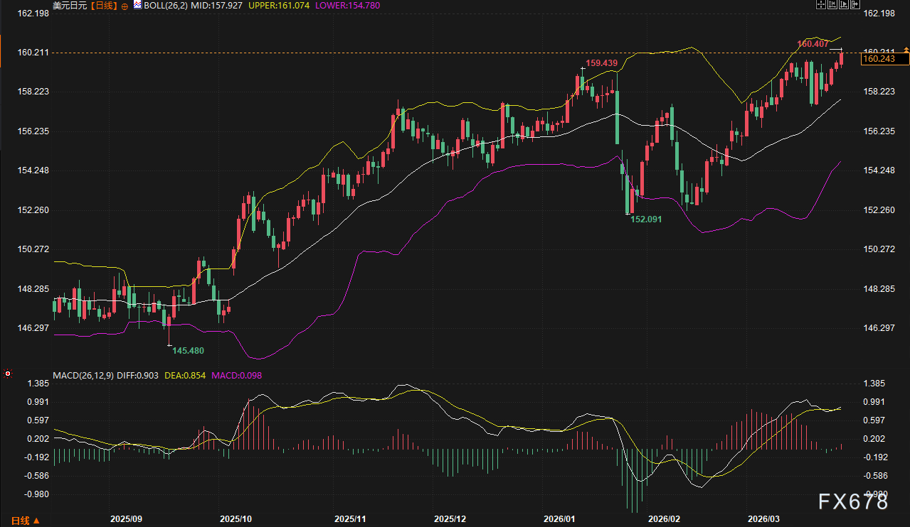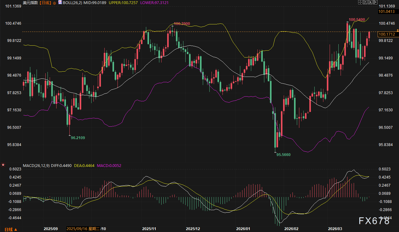 美元指数本周延续了自2月触及95.5660低点后的强劲反弹势头,周内最高上探100.5400,创下近半年新高。尽管周中出现小幅冲高回落,但后半周在避险买盘介入下迅速收复失地。MACD动能柱虽然在技术面有所收窄,但价格稳健运行在布林带中轨之上,展现出极强的趋势惯性。