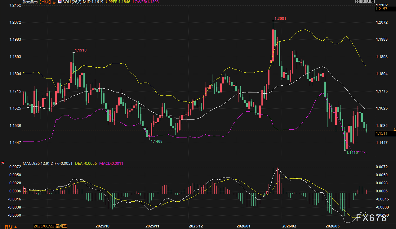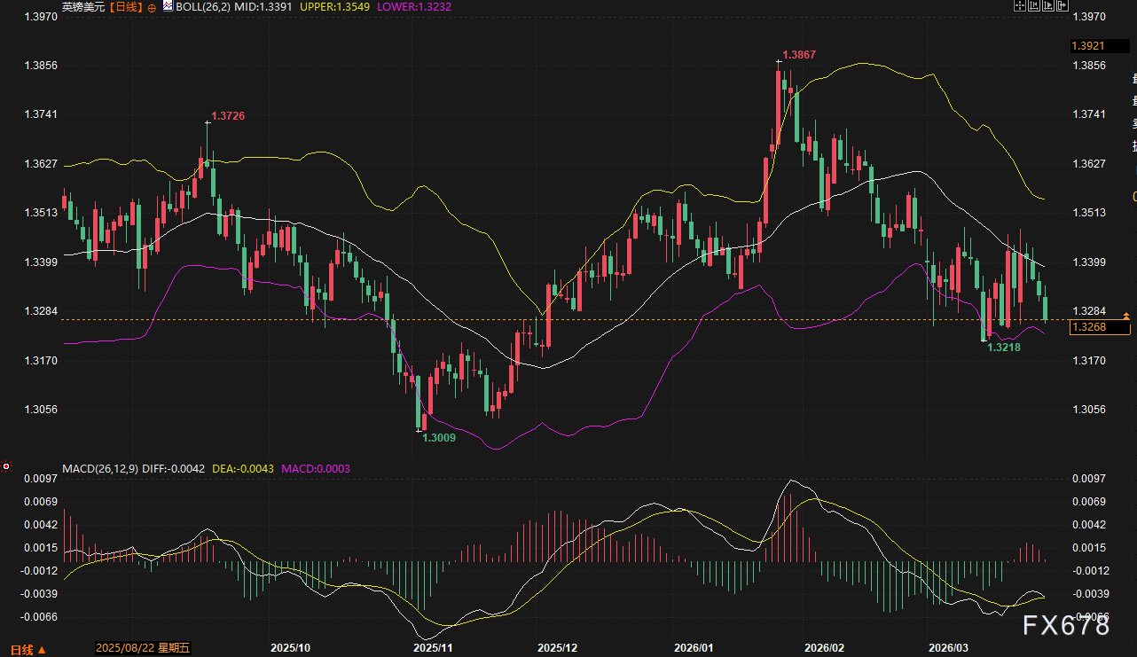 欧元与英镑本周表现疲软。欧元兑美元跌破1.1619的布林带中轨,中期下行趋势确立;英镑则连续四个交易日走低,录得0.9%的周跌幅,成为非美货币中表现最差的品种之一。MACD绿柱持续放大,显示空头动能仍在释放过程。