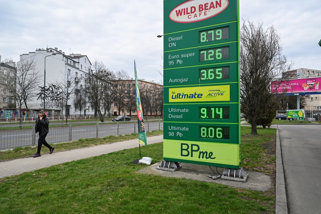 当地时间2026年3月27日,波兰华沙,一家加油站的油价牌。波兰政府将把燃油增值税从23%降至8%,燃油消费税也将降至欧盟法规要求的最低水平。视觉中国 图