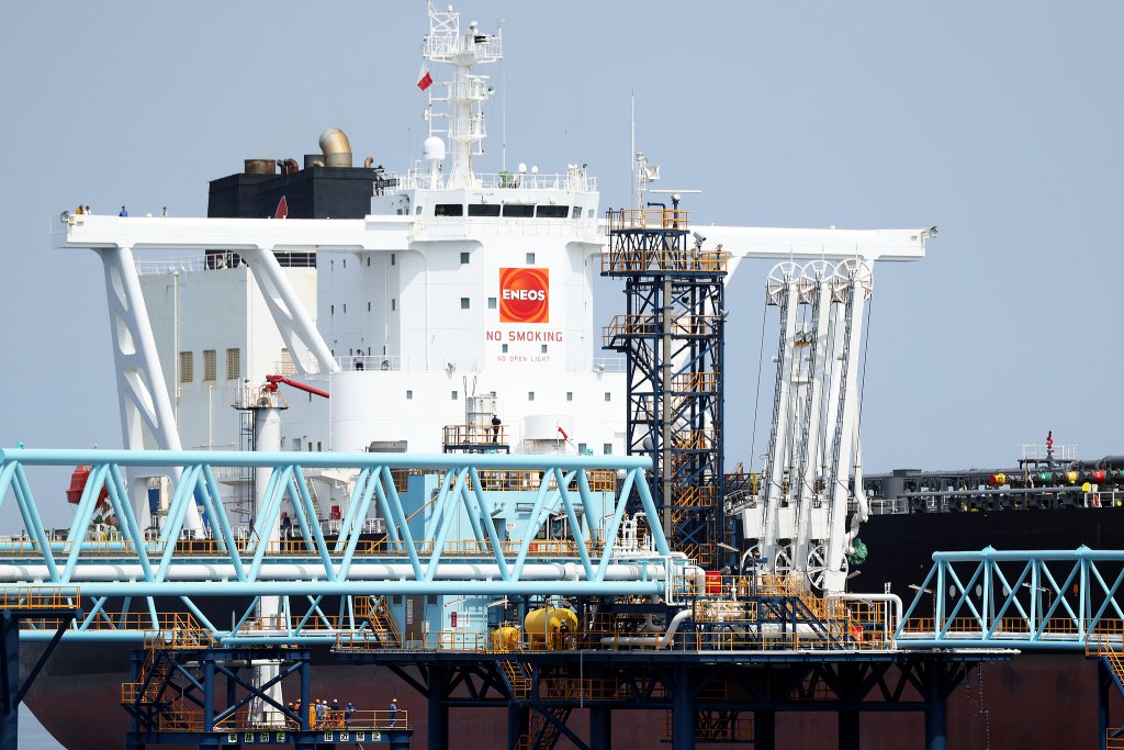 当地时间2026年3月27日,日本福冈县北九州市,Eneos Arrow号油轮抵达白岛国家石油储备基地的外海泊位。日本自3月26日起开始释放850万千升原油,约相当于一个月的消费量,以缓解霍尔木兹海峡持续被有效封锁导致的供应紧张局面。视觉中国 图