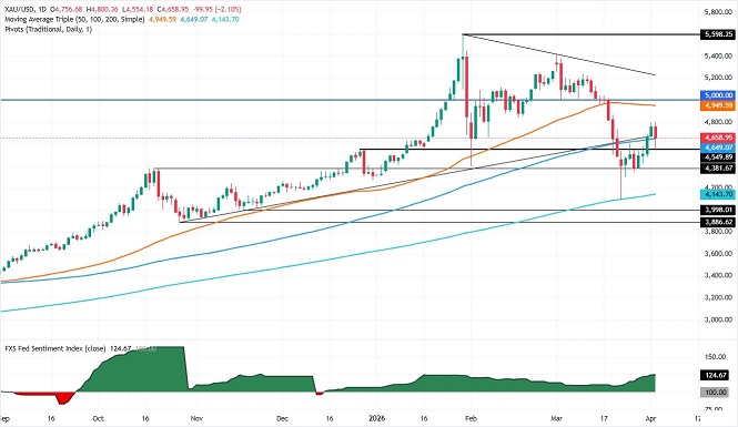 Valencia补充道,下行方面,若金价进一步走弱,其首个支撑位将是100日SMA,紧随其后的支撑位则是周四低点。一旦这些支撑位被跌破,金价的下一个目标将指向4500美元/盎司关口,从而暴露出4351美元/盎司这一近期周期性低点(即3月26日的低位)。