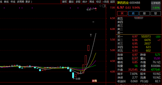 创新药部分走强,津药药业(600488)涨停走出6连板,6天累计涨幅近80%。重药控股2连板,莱美药业、双鹭药业、益佰制药(维权)等跟涨。