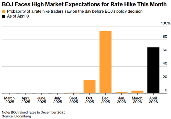 日本央行如何在4月会议前传达其意图至关重要。交易员目前预计加息概率约为70%。如此高的预期意味着,加息不会让人太意外,而如果决定按兵不动,则可能会冲击已经因伊朗冲突演变而紧张的全球市场。