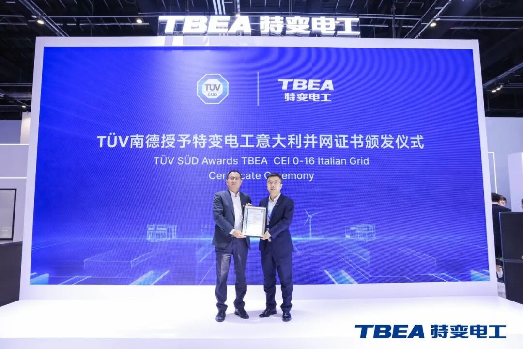 CEI 0-16 认证由全球领先的认证与测试机构 TÜV 南德意志集团颁发,被誉为意大利中高压电网接入“技术护照”。该认证的通过,表明 TE215K-HV 储能变流器符合意大利中高压配电网准入标准要求,可适配各类中高压并网场景,具备规模化应用能力。