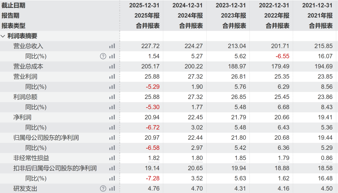 2025年年报显示,公司全年实现营业收入227.72亿元,同比增长1.54%;归母净利润20.97亿元,同比下降6.58%。这是苏泊尔自2021年以来,首次出现年度归母净利润同比下滑,呈现出“增收不增利”的态势。
