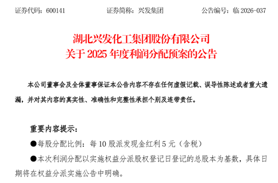 兴发集团(600141)公告,公司拟向全体股东每10股派发现金红利5元(含税),预计派发现金红利5.98亿元(含税),占2025年度归属于上市公司股东的净利润比率为40.08%。