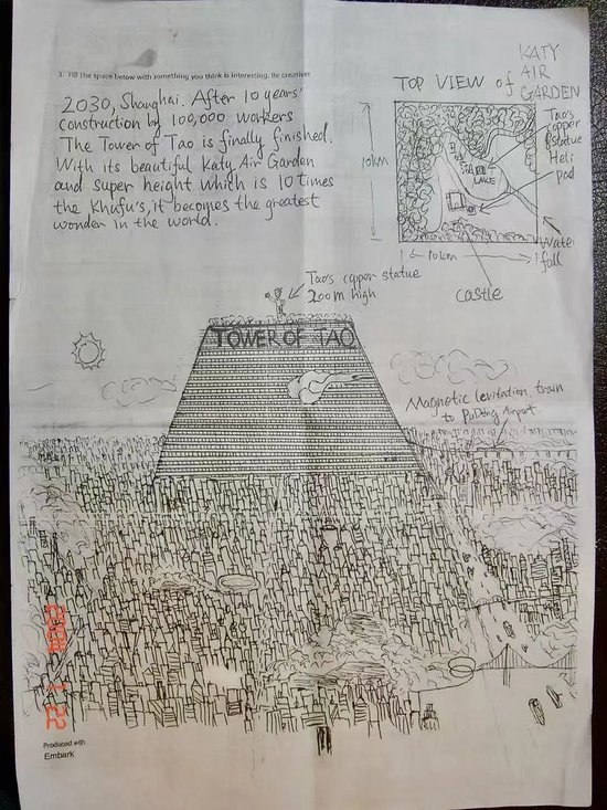 汪滔:我给你看一张我 2002 年画的图。是我当时申请加州理工大学,对方出的题,“Fill the space below with something you think it‘s interesting,be creative。” 我就画了这么个东西:上海的高楼林立中,耸立着一座巨型金字塔,顶端是空中花园,有瀑布、森林、环湖赛道,还有停机坪。