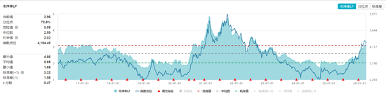 两张图大概是这样看:蓝色线是股价,蓝色阴影面积是估值,三根虚线是分位数,越靠近红色虚线说明所处历史分位点越高。