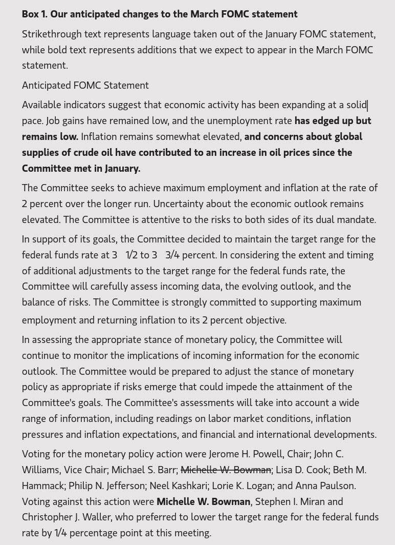 高盛认为,FOMC声明可能会承认伊朗战争增加了前景的不确定性,并可能在短期内推高通胀并拖累经济活动。声明还可能将活动增长描述为“温和”而非“稳健”。鉴于最新的就业消息,委员会可能会适度下调其对劳动力市场的描述。