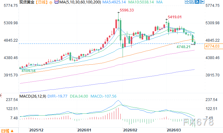 现货黄金日线图 来源:易汇通北京时间3月19日15:19 现货黄金 报 4774.03 美元/盎司