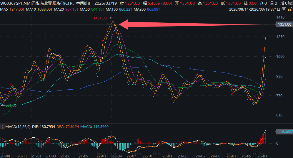 行情数据显示,截至3月19日收盘,CFR东北亚乙烯价格已攀升至1351美元/吨上方,创2022年4月以来新高。这一数字较月初时的低点696美元已几乎翻倍。