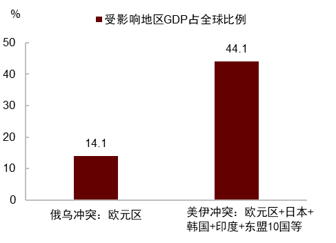 其次,从受影响国家的经济体量来看,2022年俄乌冲突主要冲击欧元区国家,欧元区GDP约占全球总量的14%。而此次冲击不仅波及欧洲,还覆盖大量亚洲国家,包括日本、韩国、印度及东盟等主要经济体,这些国家GDP合计占全球总量约44%,影响范围显著扩大(图表5、图表6)。