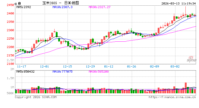 3月上旬全国玉米市场延续涨势,且呈现出期现联动的态势。从价格走势来看,截至3月10日全国玉米均价为2324.86元/吨,较2月28日2276.54元/吨上涨48.32元/吨,涨幅2.12%。分区域来看,华北地区受频繁雨雪天气影响,深加工到货量持续处于低位,企业为获取粮源频繁提价,带动当地价格上涨。东北地区虽售粮进度较往年偏缓,但基层依旧存惜售情绪,外加气温尚未明显回升,基层卖压尚未体现,当地深加工企业库存告急,收购价也被迫跟涨。期货市场同样表现亮眼,国内玉米期货主力2605合约3月9日冲高至2443元/吨,刷新新作玉米上市后主力盘面峰值,最终收报2395元/吨,较2月27日收盘价上涨35元/吨,涨幅1.48%。